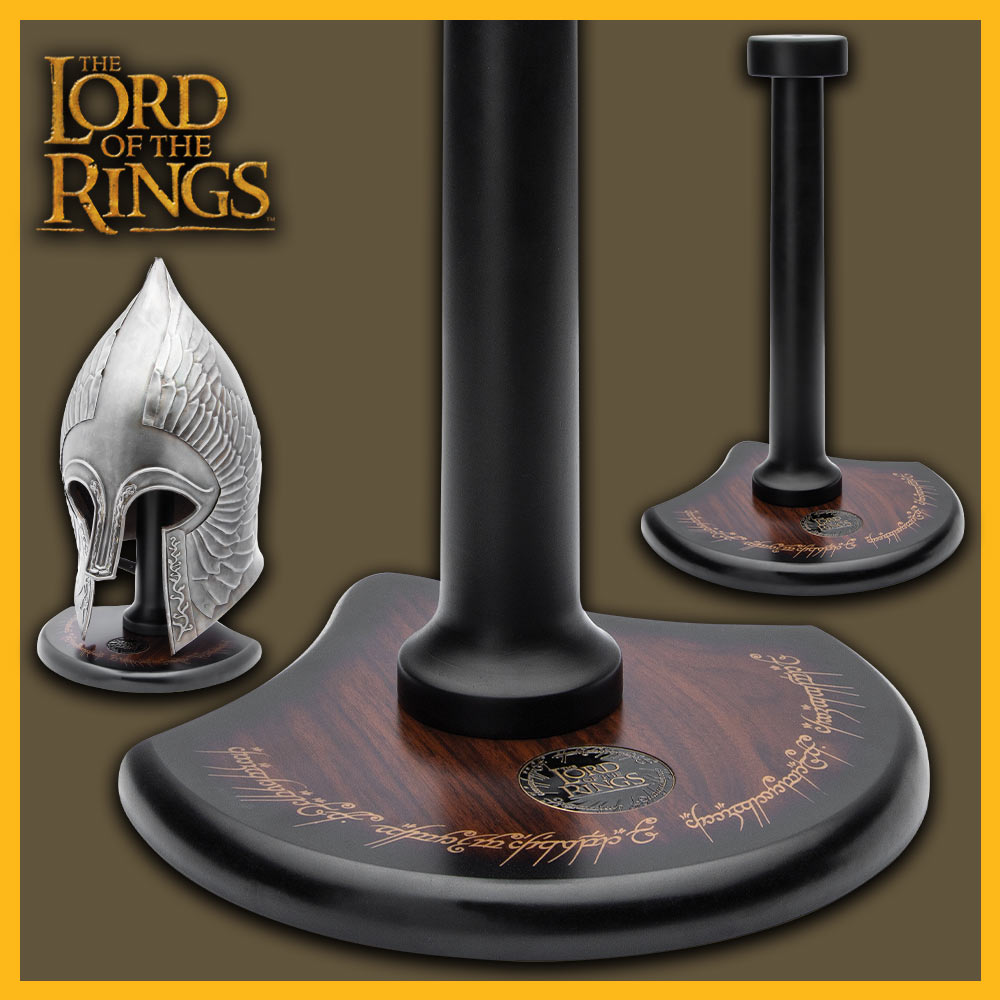 The Lord of the Rings Helm Display Stand is a premium replacement stand designed specifically for United Cutlery’s The Lord of the Rings helmet replicas. Constructed from high-quality wood, this stand showcases elegant Elven script in gold, adding a touch of authenticity and Middle-earth magic to your display. The stand includes a black and gold official The Lord of the Rings shield that can be affixed to the base, enhancing its aesthetic appeal. The shaft of the stand is easily attached using the included screw, ensuring a stable and secure display for your cherished helmet replicas. With four rubber pads on the base, your furniture is protected from any potential scratches or damage. Measuring 14 1/4" in overall height, the stand offers an impressive and functional display solution, perfect for any Lord of the Rings collection.