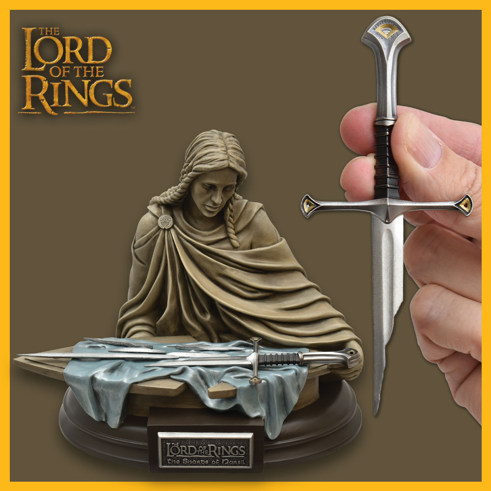 Narsil, the legendary sword from The Lord of the Rings trilogy, holds a revered place in Middle-earth's history. It was wielded by Elendil during the epic battle between the Last Alliance of Elves and Men against the Dark Lord Sauron at the end of the Second Age. In that fateful battle, Narsil's blade was shattered as Elendil fell, leaving behind the famous Shards of Narsil. These shards were carefully preserved in Rivendell, under the care of Elrond, with a prophecy that one day they would be re-forged and a king would rise again. The 1/5 scale miniature Shards of Narsil replica brings this iconic moment to life, featuring a beautifully hand-painted cold cast polyresin statue of an Elven Princess cradling a shield where the removable shards rest. The updated version of this collectible now reflects the true tan stone color and blue velvet cloth, providing a more accurate representation of the film's prop. This exquisitely crafted piece serves as a testament to the legacy of Narsil and its place in Middle-earth’s rich lore.