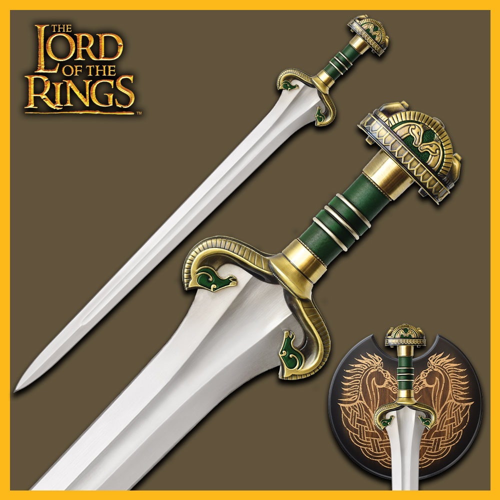 The sword of Théodred, the fallen son of King Théoden, was a beautifully crafted weapon that mirrored the sword of his cousin, Éowyn, with only subtle differences in its design. While almost identical, Théodred’s sword featured green enameling on the hilt and a green leather grip, setting it apart from its counterpart. This authentic replica is a reproduction of the original filming prop created by Weta Workshop for The Lord of the Rings: The Two Towers. With an overall length of 36 1/2”, the sword boasts a solid metal guard and pommel with an antique brass plated finish. Its 30 1/8” false-edged blade is made of tempered stainless steel, complete with a wide fuller groove, designed to capture the noble essence of the prince of Rohan. Each sword is individually serial numbered, adding to its value as a collectible. The replica comes with a wooden wall display and a certificate of authenticity, making it a perfect addition for fans and collectors alike.
