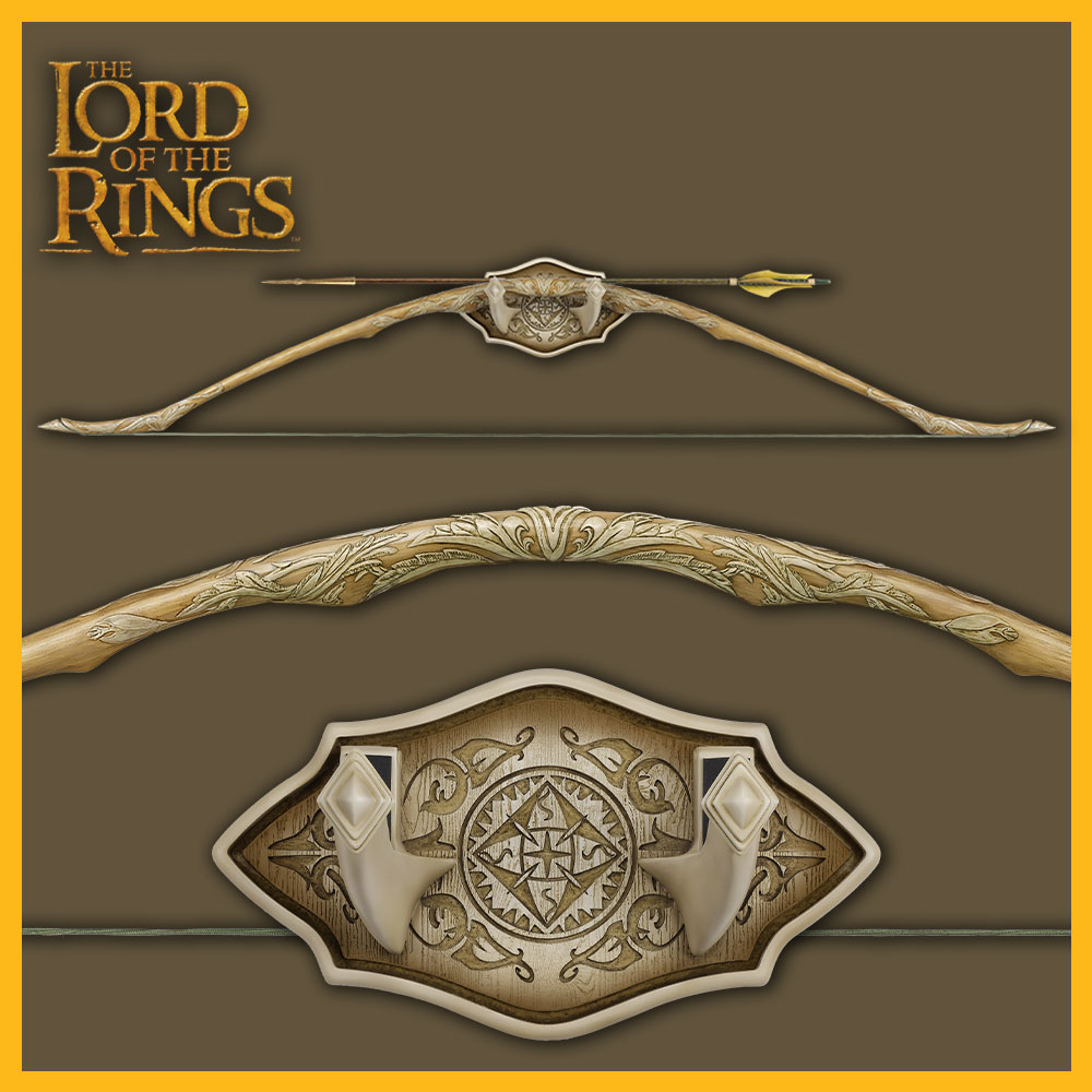 A stunning tribute to the Elven prince of Mirkwood, this replica recreates the legendary Lothlórien Bow of Legolas™from The Lord of the Rings™ films. When the Fellowship sought refuge in Lothlórien, Galadriel™ gifted Legolas with this elegant Elven bow, quiver, and arrows. Designed with extraordinary accuracy, this collectible mirrors the original film prop, showcasing intricate leaf motifs and the graceful artistry of Elven craftsmanship. Constructed from steel-reinforced polyresin, the bow captures both the beauty and strength of the weapon wielded by Middle-earth’s most skilled archer. It includes a wall display adorned with Legolas’s family sigil and a replica Lothlórien arrow, making it a centerpiece for any collection. Each piece comes with a certificate of authenticity.